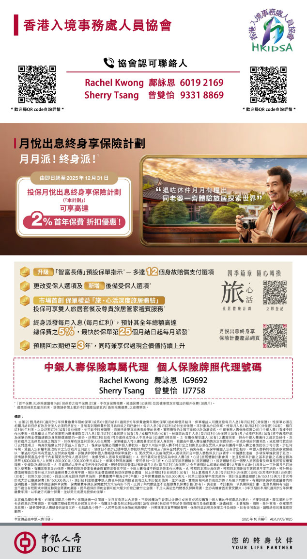 免責聲明:上述公司/集團提供優惠予本會會員, 其決定權全取於上述各公司/集團。本會非獨家獲得此集團員工優惠, 本會不會就此優惠所引起的任何損失作賠償及負上法律責任。會員若參加優惠計畫, 請小心閱讀由優惠提供者在產品上的資料或條款。特此聲明。